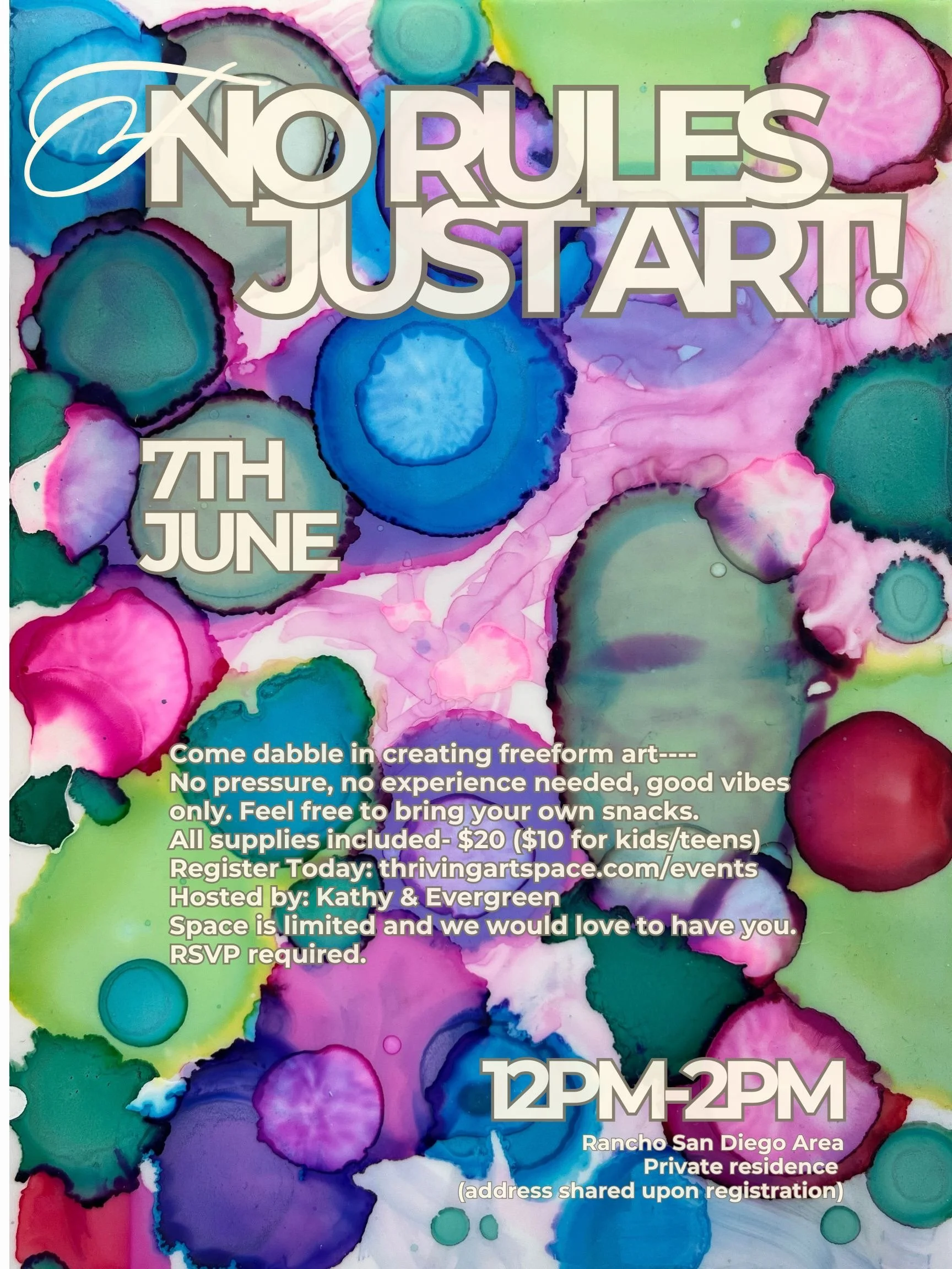 No Rules Just Art! is a freeform art experience for everyone— yes, even you! You don’t have to be an artist. You just have to show up, make something with your hands, your imagination, and zero judgment. We work with acrylics, pastels, inks, glue, beads, jewelry, fabric, glitter, textures, and so much more— some call this “mixed media.” Then, you will be guided by a loose prompt and a whole lot of freedom. There is no right way to do art. There is no wrong way, just your way. This is your time to play, to release, to breathe, and maybe even surprise yourself. Art is not about being “good” at it, rather about being present. Come as you are, be yourself in a safe space, and leave empowered by what happens when you give your soul something to say. All ages and experience levels are welcome.